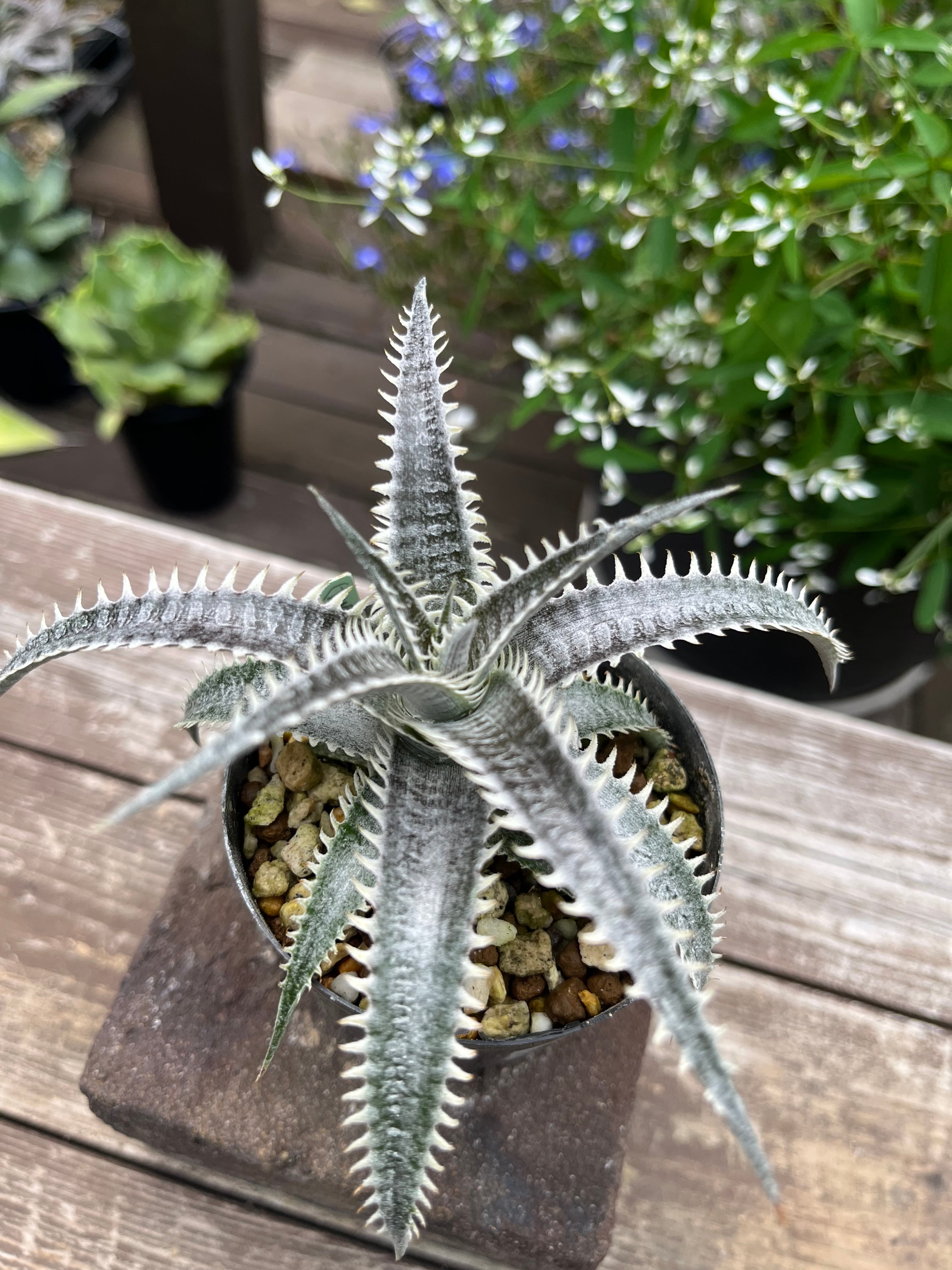 薄くトリコームの乗った葉に細かいピッチではっきりとした鋸歯が並ぶディッキア。
